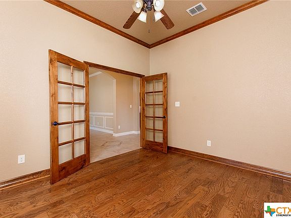 quick access to I35 for easy commute North or South to Austin and Waco. The stone facade and well manicured grounds present excellent curb appeal. You'll enter the home under the covering of the entryway and walk into your foyer space. To the left you'll find a spacious formal dining area and through french style doors to the right you'll find a private wood accented office space. Continuing into the home you'll appreciate an open concept design with lofted and coffered ceilings as well as large windows across the rear facing wall which help enhance the feeling of space and airiness. The kitchen is centered around an oversized granite topped island that's perfect for meal prep, informal dining, and entertaining. Ample cabinetry and a separate pantry provide space for storage to help maintain a space free of clutter. The living area is centered around a floor to ceiling fireplace bookended with shelving for display. In the master you have a bay window area providing more natural light and space. The attached master bath offers separate shower and tub options as well as his and hers dual vanity spaces. Secondary bedrooms provide privacy and room for kids, guests, or hobbies. Through to the backyard you'll find a peaceful environment great for relaxation under your covered patio. Call today and schedule your private showing to see more of this lovely home.