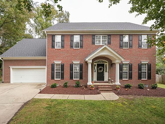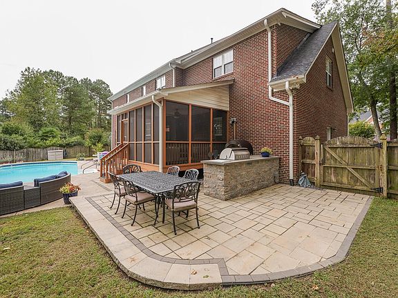 Discover timeless elegance and modern comfort in this four-sided brick home perfectly positioned on a quiet cul-de-sac lot in one of Apex's most sought after communities. This beautifully maintained residence offers a large fenced-in backyard with a sparkling in-ground saltwater pool, screened-in porch, and patio with a built-in gas grill, the ultimate setup for year round outdoor living and entertaining. Once inside, you will experience a light-filled two-story foyer with vaulted ceilings and updated lighting throughout. The main floor offers incredible flexibility, featuring a first-floor bedroom and full bath, a formal office with French doors and built-ins, an elegant dining room, and a spacious family room anchored by a gas fireplace. The updated kitchen boasts freshly painted cabinets, granite countertops, and stainless-steel appliances, creating the perfect space to gather and cook. Upstairs, you'll find 3 additional bedrooms including an oversized owner's suite with a generous walk-in closet and a spa-like ensuite bath featuring a frameless glass shower, soaking tub, and dual vanity with granite countertops. A large bonus room offers endless versatility, ideal for a 5th bedroom, media room, or home gym. Practical upgrades include updated bathrooms, a main-floor mudroom/laundry room, and a fully encapsulated crawl space for peace of mind. Located just minutes from Beaver Creek Commons, Highways 55, 540, and 64, this home combines quiet neighborhood living with easy access to shopping, dining, and top-rated schools.