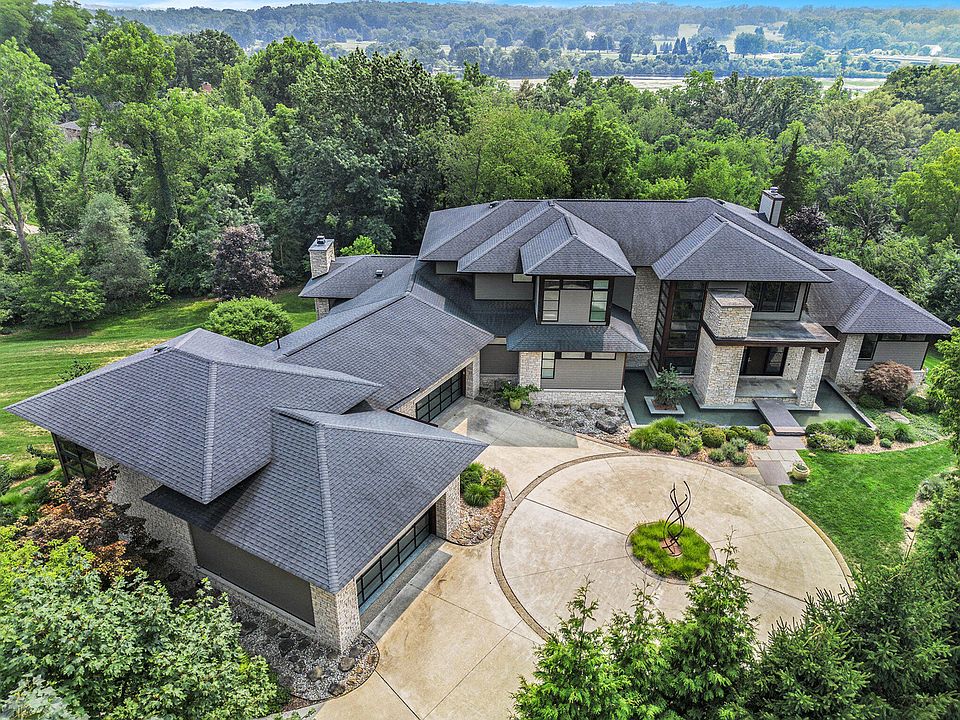 This custom built Frank Lloyd Wright inspired Prairie Modern style home located in the Heart of Ann Arbor is one of the finest homes in the area and a true masterpiece of Design, Materials, and Craftsmanship. You will be impressed at every turn, inside and out, by this truly spectacular property. The home rests on a 3 acre, double lot just minutes from all UM Campus locations and all Hospitals. The setting offers complete privacy and a stunning view of the Huron River Valley. The grounds are immaculate and feature multiple outdoor living spaces, extensive landscaping, soothing water sculpture, and entry water feature with walk-over bridge. The 8 car garage space includes fully conditioned work bay with two car lift and extensive cabinetry. No expense was spared to create one of the most incredible living experiences you have ever seen. Interior highlights include a breathtaking two story foyer with custom staircase and stone accent wall, Ipe wood flooring throughout the main level, dramatic two story living room with stone fireplace, custom display shelves, and two story windows with views to the Valley, custom kitchen with Mahogany cabinets built by Dan Young includes two islands, coffee station, professional grade Thermador appliances, and quartz counter tops with a full waterfall edge on the islands, walk-behind wet bar with wine storage, dedicated walk-in pantry with built in cabinets, 2nd refrigerator, and wet bar, comfortable open concept family room with built in entertainment center, and an incredible screened porch with fireplace, Viking grill, heat lamps, and power screens. Additional main floor features include an extensive back hall mud room, laundry room, and home work-station, main floor guest suite with attached bath, and private home office with built-in desk and cabinets, fireplace, and private balcony. The upper level includes a spectacular primary bedroom suite with custom built walnut accents, spa-like primary bath, and oversized, fully built-out primary closet, 2 additional bedroom/bath suites, and a 2nd laundry room. The finished walk-out lower level includes an oversized, walk-behind bar, home theater room with retractable divider, gaming area, sitting area, 2nd office home/play room, exercise room, and 5th bedroom/bath suite. There is an extensive list of upgrades including custom Lutron lighting and control 4 home automation for music, security, and theater. Incredible!
