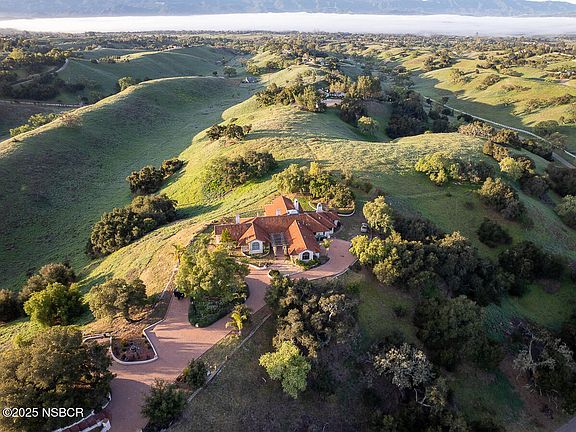 Set on 20+/- private acres in the gated Rancho Ynecita community just minutes from Los Olivos, this hilltop estate boasts breathtaking 360 views of the Santa Ynez Valley. The impressive 3,597+/- SF main residence features 3 bedrooms, 3.5 baths, a dedicated office, and refined architectural details including exposed beams, vaulted ceilings, and four inviting fireplaces. A spacious gourmet kitchen flows seamlessly into the dining area, showcasing custom cabinetry and timeless design throughout. The legal 2 bed, 1.5 bath guest residence provides versatile accommodations or potential rental income. Additional amenities include a permitted downstairs office, storage room and full bathroom, owned solar, and access to a reliable mutual water company. Gated entry, mature landscaping, and multiple terraces invite serene enjoyment of the exceptional Santa Barbara Wine Country setting. Built in 2002, this rare offering effortlessly blends privacy, sustainability, and flexibility in one of Santa Ynez Valley's most desirable enclaves.