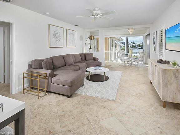 Light-Filled Waterfront Living overlooking the Naples Bay. Experience effortless living in this bright and breezy second-floor condo located in a boutique water-side community of just 21 units on Moorings Bay. Perfectly positioned between the Gulf and Naples Bay, this two-bedroom, two-bath condominium lives like a private villa, with windows on all sides inviting in soft natural light and tranquil views of lush courtyards, the waterfront pool, and shimmering bay. Thoughtfully updated, the two bedroom unit features an open-concept layout with marble countertops, light coloring, and tile flooring throughout. Residents also benefit from direct Gulf access, available boat dockage, and waterfront leisure just steps from home. Located within walking distance to Naples' famed white-sand beaches and less than a mile from the shops and fine dining of Venetian Village, this residence is offered fully furnished and available immediately.