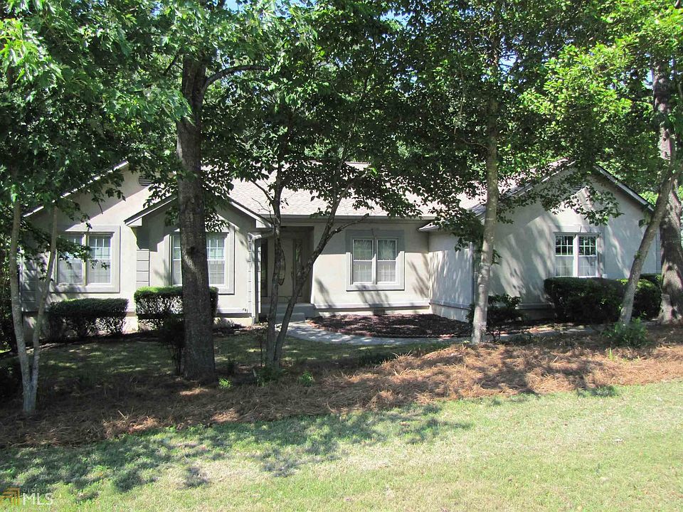 Beautiful ranch home with lake views from large trellised deck. Hardwood floors throughout foyer, living and dining rooms as well as separate den. Dining room accessed through dual sets of beautiful French doors. Kitchen features tiled floors, counters and backsplash, new stainless dishwasher, and electric range and double oven. Huge master suite with deep trey ceilings and private bath. Great school district! Small, peaceful neighborhood with quiet lake perfect for paddle boat, canoe or just a view. Minutes to I85 and Mall of Georgia.