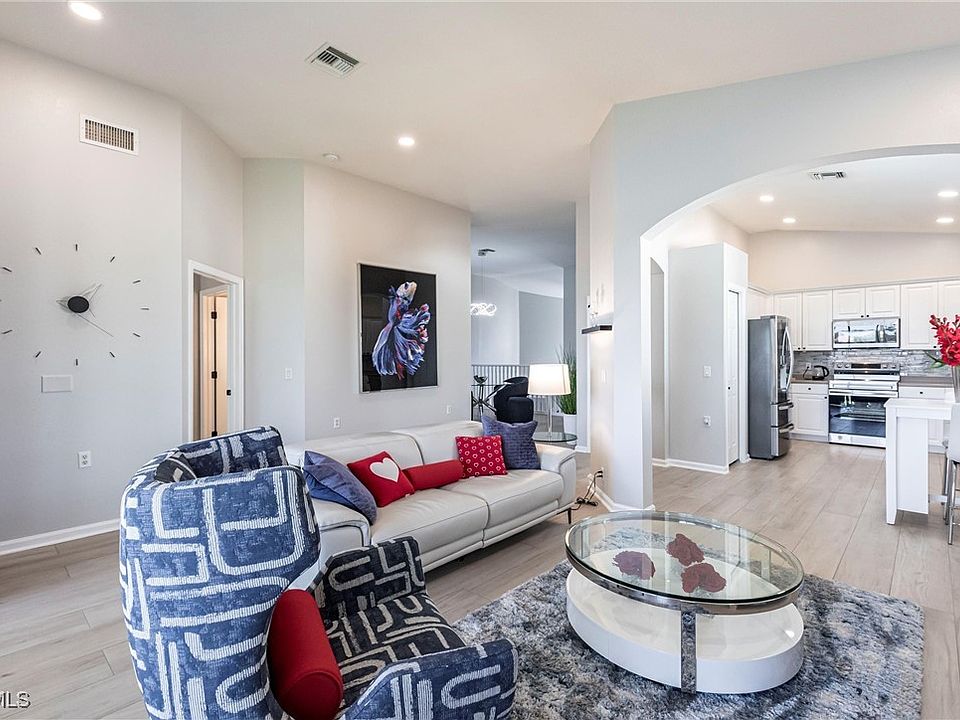 Upon entering the home, you are greeted by an open floor plan leading to a spacious family room with views of the golf course and lake. Adjacent to the family room is a versatile sitting area that can serve as a dining space or office, featuring a shiplap wall and a bar. The kitchen showcases updated white cabinets, brand-new stainless steel appliances, a pantry, and an attractive backsplash.