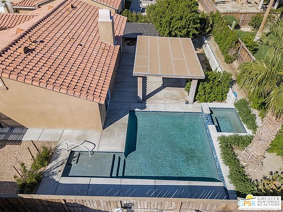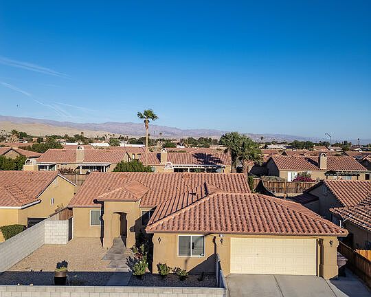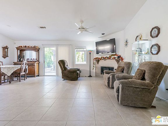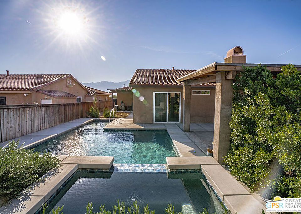 This beautifully upgraded 4-bedroom, 2-bathroom home offers an ideal blend of comfort and style, featuring a sparkling saltwater pool and a lush backyard with a charming pergola perfect for outdoor relaxation and entertaining. The fully enclosed front yard, bordered by a sturdy block wall, ensures both privacy and curb appeal. Inside, you'll find a spacious galley-style kitchen with ceramic tile floors, tiled countertops and a raised peninsula bar that opens up to the inviting living area. With vaulted ceilings, plenty of natural light, and a cozy gas fireplace, this home is perfect for gatherings both big and small. The primary suite features a walk-in closet, sliding door access to the backyard, and a double-sink vanity. Ideally located across from the community center and just minutes from I-10, shopping, dining, and entertainment. Plus, there's no HOA. This is an excellent opportunity for a first-time homebuyer or investor to add their personal touches and make it their own. Don't miss out on this Thousand Palms gem!