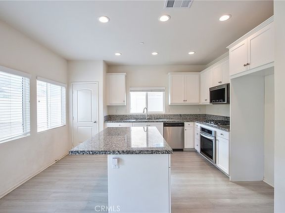 The open-concept floor plan flows into kitchen with white cabinets, granite countertops, stainless steel appliances, and a walk-in pantry.