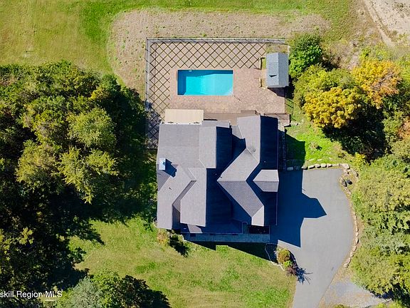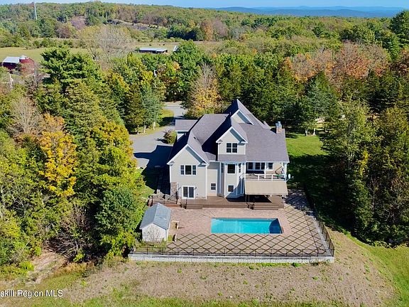 This home is built for entertaining. The soaring high ceiling of the great room leads right outside to the terrace and opens up into the kitchen and dining room as well. With 4 bedrooms and multiple extra rooms, the entire extended family can gather. The downstairs full finished basement is designed for entertaining by the pool and would make a great mother-in-law unit with proper permitting. The heated saltwater pool allows you to enjoy the fun early and late into the season. The house is seated on 6.1 acres that descend down to the Kaaterskill Creek at the bottom of the hill. Privacy is insured in the deed as neighbors are not allowed to take down trees in between the property borders. You must come and see the view from each and every room to truly appreciate this one-of-a-kind property. Everything you could want and only 5 minutes from the Village of Catskill.