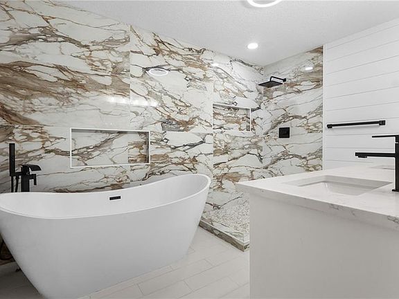 Standout oversized electric fireplaceJaw-dropping primary suiteSpa-level bathroomCompletely renovated farmhouseStylish wood shelvingModern farmhouse warmthImmaculate tile work