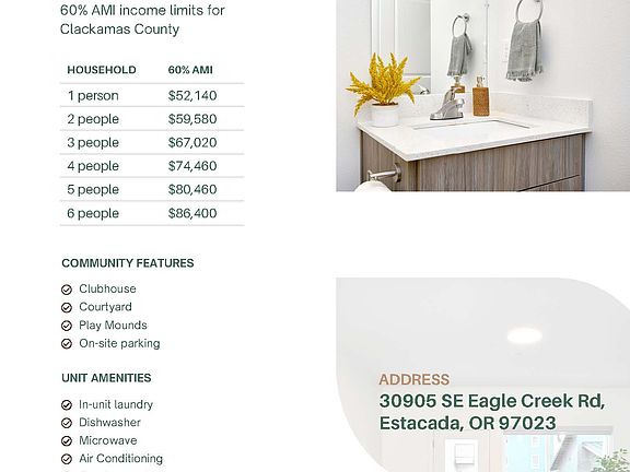 Wade Park offers beautiful, brand-new homes designed with quality, comfort, and affordability in mind. Our apartment homes are perfect for those looking for space, convenience, and modern amenities in Estacada. Units are income-restricted, making them accessible for households earning less than 60% of the Area Median Income (AMI) in Clackamas County.