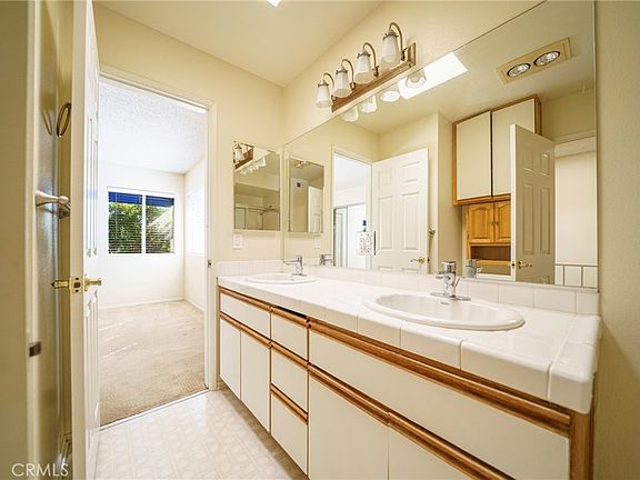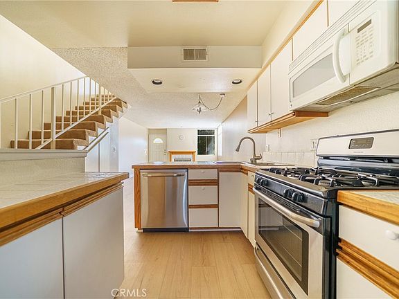 Quaint and delightful 2 bedroom, 1.5 bath townhouse in a gated community with a great floor plan. Features include newer laminate wood floors in living room with fireplace, carpet upstairs, skylight, dual sinks in primary bath, and updated kitchen with recessed lighting, built-in cabinetry, and opens to a private patio-ideal for entertaining or enjoying. In-unit washer, dryer, and refrigerator included. Community offers pool, spa, guest parking, and 2 assigned spaces. Located in award-winning school district!