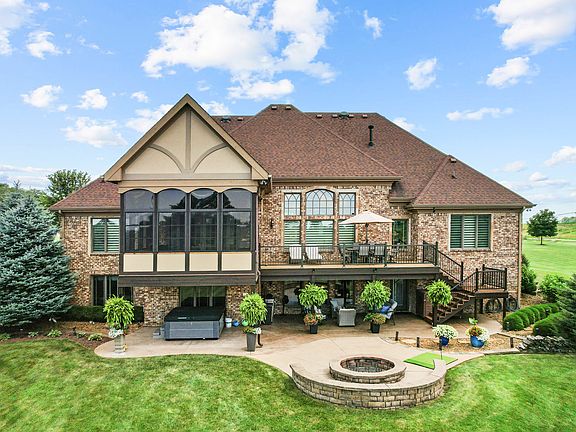 Welcome to refined living at The Legends Golf Club in Franklin, Indiana. This custom home sits on 2.8 beautifully landscaped acres with peaceful golf course views and an ideal blend of luxury, comfort, and craftsmanship. Inside, the entire house has been freshly painted and features new engineered hardwood flooring that pairs perfectly with the home's rich woodwork and detailed trim. The kitchen is a true standout with a large island, quartz countertops, double ovens, wine fridge, ice maker, and stunning custom Amish-built cabinetry. The built-in fridge and pot filler add convenience, while the open layout flows into a spacious living area with built-ins and coffered ceilings, creating a warm and elegant gathering space. The main-floor primary suite offers a quiet retreat with a walk-in tile shower, double vanities, and a custom walk-in closet with built-in cabinetry and center island. Just off the entry, you'll find a private office with natural light and easy access for guests or clients. Outdoor living is just as impressive. Relax in the newly updated three-seasons room, take in the view from the composite deck, or enjoy the covered patio below. The walk-out basement adds even more space with a full bar and second kitchen, theatre room, game area, guest bedroom with full bath, and generous storage. There are two separate two-car garages for a total of four bays, offering plenty of room for vehicles, hobbies, or a workshop. From the timeless finishes to the incredible setting, this home offers a rare combination of elegance, space, and location.