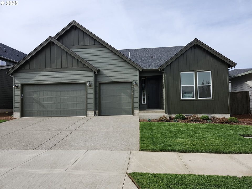 Welcome to Marion Pointe Located approximately 30 minutes from Salem and Portland with easy freeway access. Set on the backdrop of the lush Oregon Golf Association Golf Course. 11 foot ceilings in the great room create a grand, airy atmosphere, making the space feel open and inviting. The dining nook adds character and function, offering a place for a hutch or sideboard, while a nearby pantry closet maximizes storage. The kitchen is built for ease, with an oversized island, walk-in pantry, and prep area—helping you stay organized and stress-free. A covered patio extends your living space outdoors, providing a private retreat for relaxing mornings or entertaining guests. With a 3-car garage designed for maximum functionality, the third bay offers flexible storage while a water heater nook maintains ample clearance for parking. This home is completed an move in ready