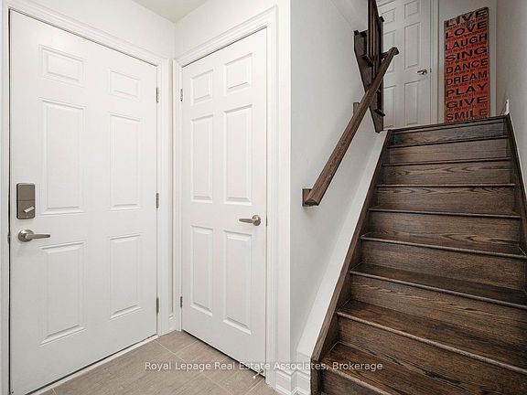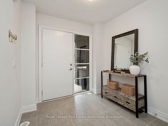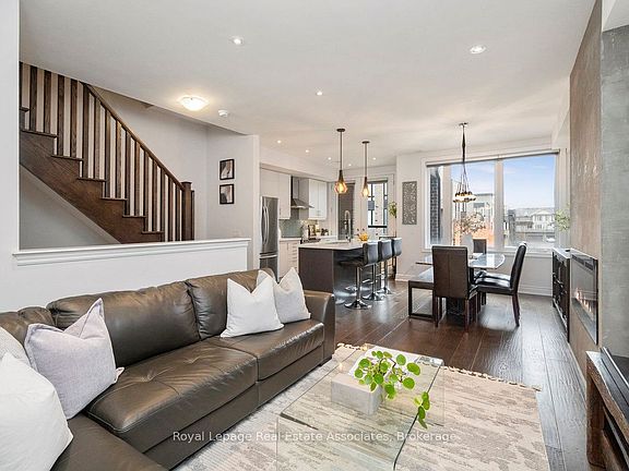 Welcome to 3076 Cascade Common, a beautifully upgraded 2-bedroom, 3-storey townhome located in Oakville's desirable Joshua Meadows community. Offering approximately 1,310 sq ft of living space plus an estimated 412 sq ft private rooftop terrace, this home is perfect for entertaining or relaxing with prime south and west-facing views. The main level features 9 ft ceilings with pot lights on dimmers and a seamless flow from the modern kitchen to the dining and living areas. The kitchen boasts stainless steel appliances, a large island with built-in sink and seating, quartz countertops, under-cabinet lighting, and a glass tile backsplash, and offers a walkout to a private balcony - ideal for morning coffee or evening unwinding. The living area is complete with an electric fireplace finished in modern concrete. Additional highlights include $47,000 in builder upgrades upon construction (2017), such as premium hand-scraped solid white oak hardwood floors with an elegant cashmere finish throughout, upgraded stairway spindles, and thoughtful design touches that elevate the home's style and comfort. The private rooftop terrace is a true retreat, featuring gas and water hookups for BBQs, outdoor dining, and gardening. Enjoy the quiet setting within walking distance to parks, shops, and local amenities. William Rose Park is just steps away, offering tennis, pickleball, baseball, splash pad, and more. Conveniently close to trails, restaurants, GO Transit, and Oakville Trafalgar Memorial Hospital. Monthly POTL fees of $64.67 cover road maintenance and garbage removal. Don't miss this opportunity to own a stylish, well-maintained home in one of Oakville's most sought-after neighbourhoods - Joshua Meadows!
