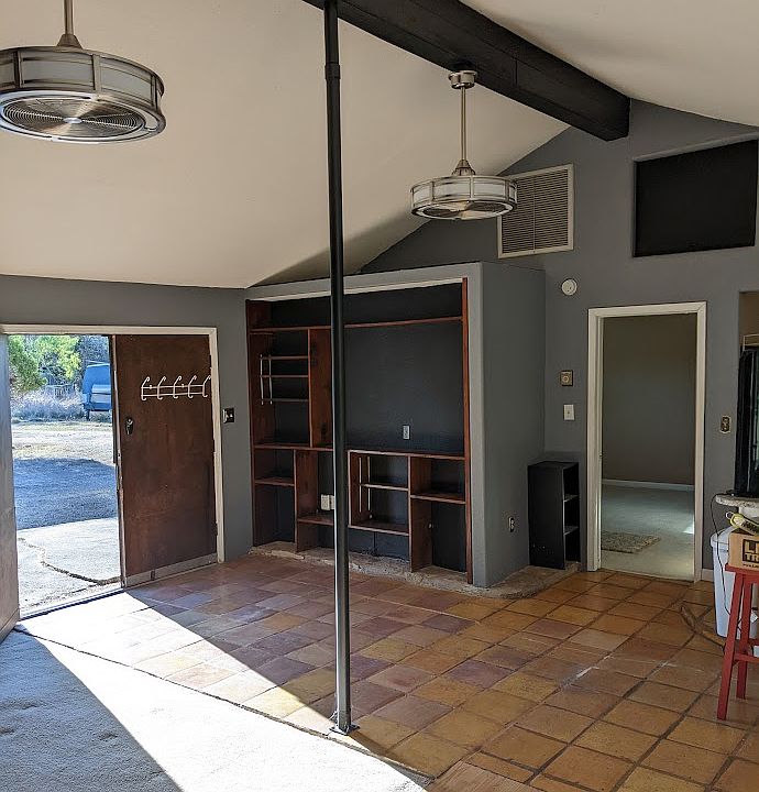 It has an electric range, frig, Microwave, ceiling fans, window ACs, 400sf covered back patio with Washer & Dryer connections.
