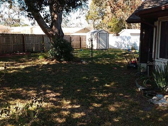 Spacious 3 bedroom, 2 bath, 2 car garage home located in a quiet neighborhood with no HOA. This single family home features a great floor plan that offers a living-dining room combo with vaulted ceilings. Nice sized split plan bedrooms and an eat-in kitchen. Over-sized Florida room that overlooks the Large fully fenced back yard with mature landscaping. Home also offers a shed for extra storage. Appliances replaced within last 4 years, Roof 2002, A/C 2011. Hurricane shutters for your safety. Needs repair/TLC. Close to the Suncoast Parkway with easy access to Tampa.