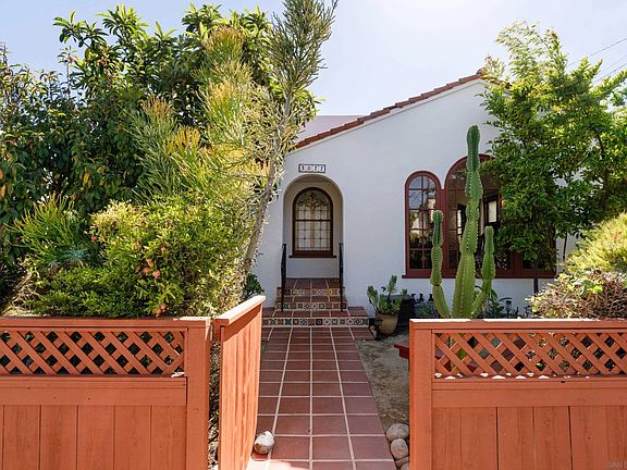 This beautifully updated Spanish Revival home in the heart of North Park blends timeless character with thoughtful modern upgrades. Set on a corner lot with street and alley access, it offers spacious front, side, and rear yards framed by mature landscaping and fruit trees. Period details include stunning stained glass windows, a graceful coved ceiling and rounded archway in the living room, and original hardwood floors. Recent improvements bring contemporary comfort—smart home controls, newer water heater, central AC, foundation and sewer upgrades, added insulation, and a gorgeous kitchen renovation featuring new appliances, floor-to-ceiling cabinetry, a farmhouse sink, custom laundry closet, and breakfast bar. The single-level floor plan includes two bedrooms and one full bathroom with a tub-shower, while a meticulously refinished detached flex space includes a Murphy bed, closet, and full bath. A powered vehicle gate provides secure off-street parking with plenty of yard space to spare, and a large storage shed offers ample room for bikes, tools, and more—all just steps from North Park’s vibrant shops, parks, and restaurants.