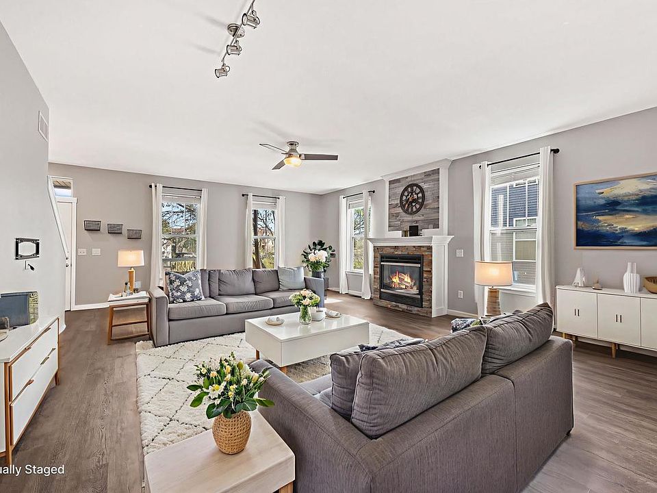 THE PERFECT SPOT, THE PERFECT PRICE! This 3 bed, 2.5 bath townhouse welcomes you with a bright living room, featuring a gas fireplace, and gleaming wood floors throughout the main level. The open layout flows into the kitchen, complete with a breakfast bar and pantry. The office and half bath completes the level. Upstairs, the primary suite offers a WIC & ensuite bath. Two additional bedrms are served by a full bath. A private entrance, in-unit laundry, and 2-car garage add convenience. Stairs & deck will be replaced w/ Trex, it has been paid for by the seller already. Pets are welcome, and the location can?t be beat, just a 5 min walk to Costco, with Woodman?s, Target, cinema, restaurants, and parks all within easy reach. Live bright, live connected, and make this prime location your own