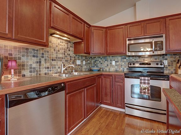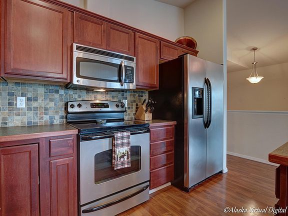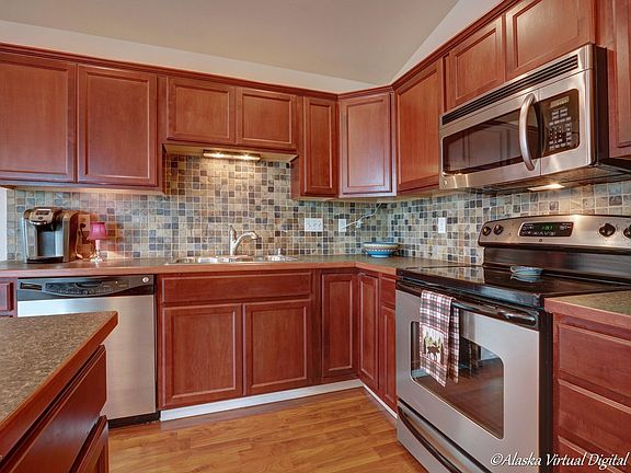 Located on a quiet cul de sac this reverse floor plan features a vaulted & sunny Great Room with laminate floors. The large island & breakfast bar with upgraded cherry cabinets, full tile backsplash & stainless steel appliances make this a kitchen to enjoy. Lovely pendant lighting & upgraded spotlights enhance the room. The direct vent gas fireplace offers a slate surround and mantel. The master bedroom enjoys elegant laminate floors and an ensuite bath with a separate powder room for guests The southeast facing deck allows for barbecued meals off the Great Room with lovely views of the Chugach. One lower level bedroom features doors to the lower deck. Window coverings, refrigerator, and washer and dryer are included.