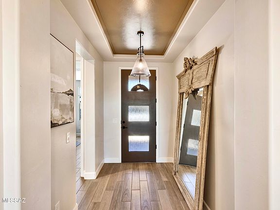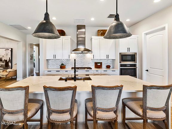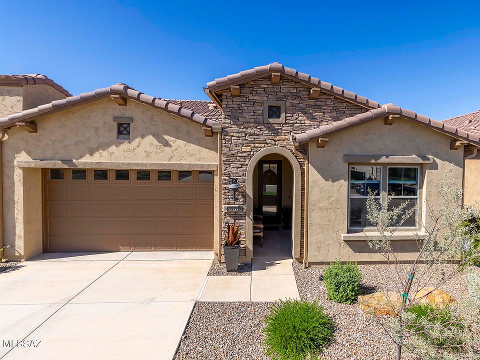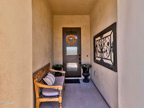 This stunning Viva model truly has it all! Nestled in the newest Villa section, this 4-year-old home offers modern & luxurious upgrades. Step inside to discover a highly upgraded villa with a contemporary kitchen featuring Restoration Hardware designs throughout. The chef's kitchen features an oversized farmhouse apron sink, wall ovens/microwave, a high-performance cooktop, quartz countertops & large island. Spacious den/office. The walk-in curbless shower is luxurious. Garage has an epoxy floor & a tankless water heater. The large, extended courtyard features a covered patio and overlooks a lush, common grass area, creating an outdoor retreat with views of the Catalina Mountains and stunning sunsets. Don't miss this opportunity to live the dream at SaddleBrooke Ranch!