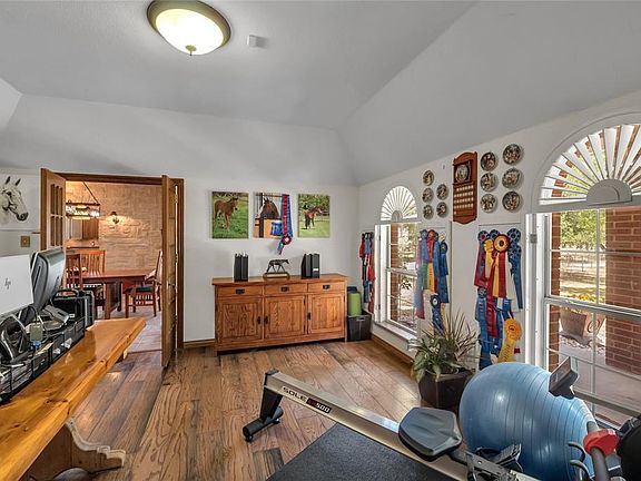 Three beautiful parcels combined to create a 10.323-acre, AG exempt, horse property complete with beautiful custom home and a relaxing shaded backyard paradise with pool, spa, pool house and room for future covered outdoor kitchen.8-stall barn has water, electricity, stall savers and has been updated with LED lighting. Barn also includes, tack area, large hay, shaving and feed storage along with covered exterior wash rack. Professional 220x140 arena is partially covered for cooler summer riding. Open arena has lighting for night riding. Smartly laid out acreage with well-established grasses have 11 cross-fenced pastures, 4 with lean-tos, most with electric and no-climb fencing. Water has been added to every pasture! Property has its own 650' deep well for private water!5 Bedroom home offers true Texas feel with custom lighting, flagstone floors, tiles with horse and barbwire artwork etched into it and stone accent walls in kitchen and dining area. True Chef's Kitchen, great for entertaining, boasts island, granite counters, stainless commercial style gas cooktop, 2 dishwashers, a custom pantry and lots of cabinets for storage. There are 2 Study options, perfect for work at home or an extra living area, one has a built-in desk. Spacious Family Room has stone fireplace and built-in cabinet. Master Suite down has new Hardwood flooring, newly updated custom tile flooring, shower, tub and counters as well as a hidden spiral staircase that takes you up to Game Room connected to private suite which serves as a great second Master or teen retreat!Rustic Hardwood stairway leads up to 4 ample sized bedrooms all with built-in desks and upgraded bamboo wood flooring, 2 baths and loads of extra closets for storage. This floorplan offers lots of options! Extended Covered patio boasts patterned stamped concrete decking and is prewired for future grill area! Custom LED twinkle lighting has been added to huge Ash shade tree over pool area. Covered front porch is perfect for a cool drink and watching your horses graze! Updates include: AC Units, Master bath and Bedroom wood floors, kitchen cook-top, extended back patio with cover. Back 5 acres are great for growing your own hay or building more structures as needed. 2 car garage is 3 bays across, includes work bench and cabinets offering great storage area or parking for small vehicles, tractors, etc. Barn is wired for auto watering. Property has 2 electric meters, one for arena. Roadway access from front of property as well as to back parcels. Easy access to downtown Denton, Major Shopping, Restaurants, Highways, and two major Universities. 2022-08-24