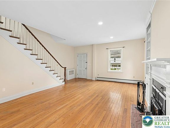 - Description: Wood floor; fireplace with brick hearth, brick surround, wood-burning stove insert and painted wood mantel with dentil molding, flanked by floor-to-ceiling bookcases with cabinets below; walk-in closet w/built-in shelving; 3 windows