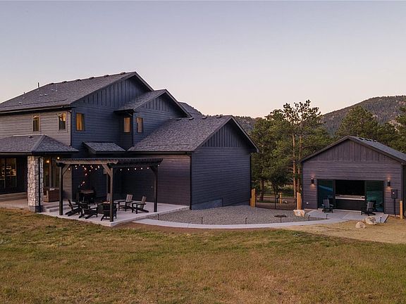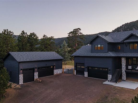 Welcome to this exquisite luxury mountain home in Burland Ranch Acres. The abundance of serenity on this fully fenced 1-acre property is one of a kind. Offering privacy, recreation & relaxation, this home was built to live like a retreat. Centrally located to Boulder, Downtown Golden, Golden Gate Canyon State Park, Arvada and just 1 hour from DIA, it’s the perfect place to experience mountain living & stay connected to city happenings. The well appointed kitchen has top of the line GE Monogram appliances with 6-burner gas range oven, a high speed wall oven, custom hardware, pendant lighting, range, hood & quartz counters. A large kitchen island provides additional seating adjacent to the dining area and living space. The main floor has 9” wide white oak hardwood throughout, office, mudroom w/ built in bench & storage, powder bath and gas fireplace. The upper level primary bedroom features a walk-through laundry room to the walk-in closet, en-suite bathroom w/ double sink vanities & ample storage, custom tile work, an oversized shower w/ bench & built-in nooks for storage. All bedrooms throughout include darkening shades for comfort. The spacious finished basement is set up as a family & game room and includes an additional 5th bedroom or flex space. A luxurious steam shower in the basement for the ultimate spa-day. This home is one of the few mountain homes w/ central A/C, whole house humidifier, water filter & softener & tankless hot water heater. For the garage enthusiast - 7 spaces total - An oversized attached 3 car garage includes an electric car charger & 14’ ceilings. The detached 4 car garage has 2 - 220v plus separate electrical for the swim spa. Built with 6” rebar reinforced concrete slab & insulated walls and 14' ceilings. Double sliding glass doors open up at the swim-spa to further the connection to indoor/outdoor living. This home is equipped with a high level treatment septic system, 300 gallon water storage and a 1,350’ well providing house water.