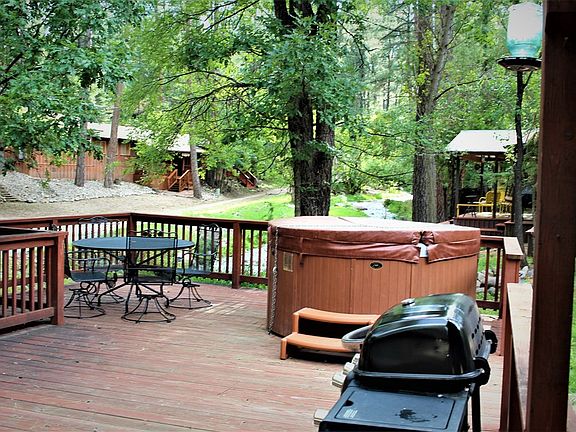 Ruidoso River Frontage awaits you at this Beautiful Authentic Remodeled Cabin. Two Bedroom, two bathroom, laundry room/mud room, all one level,and level entry, The wrap around covered porch/deck is a great place to relax & enjoy the river view, there's also a hot tub on the deck over looking the river. This cabin's features include hard wood floors, gas fireplace, 2 living areas, custom kitchen with stainless steel appliances. The cabin is equipped with LG heating/AC units through out. Property comes fully furnished, ready for you to enjoy immediately! This is such a wonderful mountain zen style cabin, I guarantee you won't want to leave it.