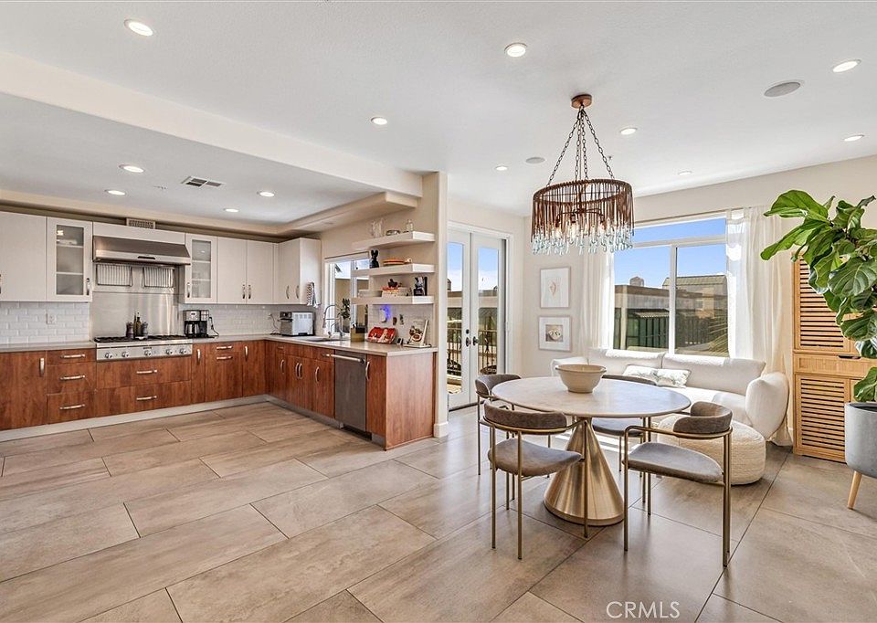 The chef-inspired kitchen is beautifully designed with warm wood-stained cabinetry, quartz countertops, subway tile backsplash, top-of-the-line appliances, and a wine refrigerator—all opening to the dining area with breathtaking city and ocean views. French doors lead seamlessly to a private viewing deck, creating the ultimate setting for indoor-outdoor living.