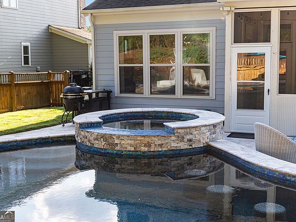 Impeccable Peachtree City residence in coveted Everton Parkside with a private luxurious pool! Travertine paver patio with a stunning Bellareed Luxury Pebble Tec pool and hot tub. Hardwood floors usher you into the foyer, hosting a perfect light-filled office with French doors to the covered brick front patio! Lovely open floor plan ideal for entertaining, with the living room flowing into the adjoining kitchen. The breakfast area features gorgeous views of the stunning, professionally landscaped backyard oasis! You can dine in the screened-in patio while enjoying the outdoor air. The formal dining room and guest powder room complete the main level for seamless entertaining. The second story hosts the private, oversized primary bedroom suite with a relaxing sitting area and a luxurious bathroom with a spacious shower. Three additional bedrooms on the second level provide ample space for sleeping, playing, and working. Surprise loft area to enjoy company, relax in the evening, or add workout equipment. Don't forget the second-level porch, perfect for a book and a cup of coffee. Don't forget the extended golf cart garage, which accommodates a 6-seater golf cart, as well as storage & gym. This home is a show stopper! Everton offers a prime Peachtree City location with a series of amenities, including a network of parks and golf cart paths that connect the neighborhood to the rest of Peachtree City's golf cart paths. Other amenities include: two swimming pools, a splash pad, an open-air cabana, playgrounds, walking trails, tennis, and pickleball courts. Located in the award-winning McIntosh School District! Close to I-85 and an easy drive to Hartsfield-Jackson International Airport.