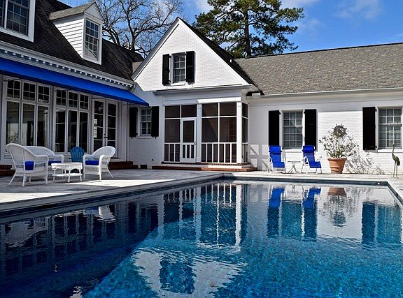 This delightful sunny residence was built on the site of St. Angela Academy on Aiken's prestigious Berrie Rd. Easy access to Hitchcock Woods. Handsome mill work with high coffered ceilings & tall windows. Central vacuum. Custom lighting. Surround sound. Wood, tile,& marble floors. Storage space abounds. Chef's Kitchen has 8 gas burner Wolf oven, wine fridge, ice maker, & gorgeous granite counter tops. Paneled library with vaulted ceiling. Elegant living & dining rooms. Large tiled sun room has a bar & french doors that open to the heated salt water gunite pool nestled in the Travertine marble patio. Master Suite has huge walk-through closet and a screen porch that faces patio & pool. Master Bath has jetted tub, private water closets, & large walk in shower. 2 bedrooms upstairs connect by Jack-n-Jill bathroom. 2nd floor sitting room and walk in attic storage & cedar closet. Superior 3-stall barn w/wash stall, tack & feed rooms, & half-bath. 3.19 acres. 3 large board-fenced paddocks.