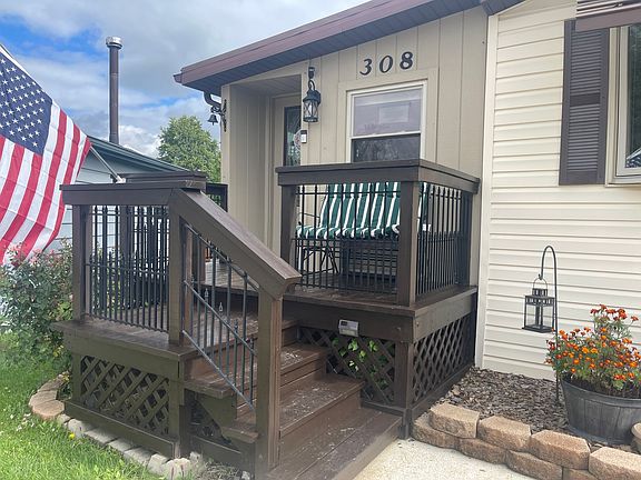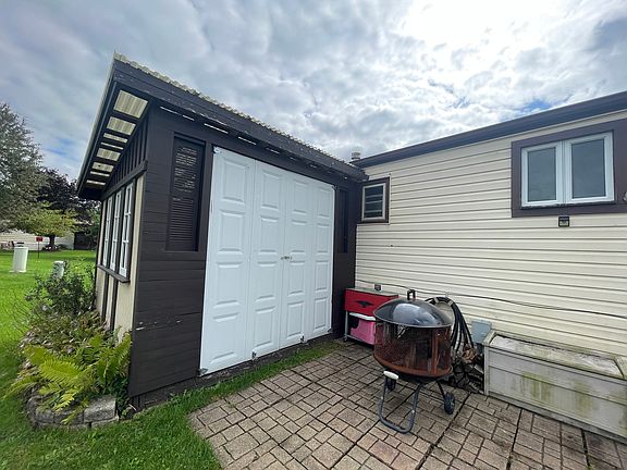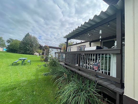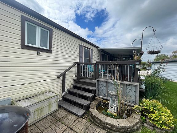 This UPDATED Schult home features beautiful outside deck, fenced area for dogs, shed with add-on storage, 3 seasons room with pot belly stove (bar does not stay) Wood-like floors in Kitchen/living area with bay/bow window and newer Levelor blinds in Kitchen. Newer H2O, newer furnance, a/c and electric motorized blinds in living room. Thermopane popout windows, all Stainless Steel appliances stay. Newer LG stainless washer/dryer, refer and stove 2 years old and dishwasher 1 year old. New bath fan and in the kitchen newer backsplash. A new patio door was put in for EZ access to the deck. Bath remodeled with 2 year old jacuzzi tub. Newer paint and trim. Newer roof on shed and home. 3 wide drive with garage is TANDEM and has small work shop area. All ceiling fans stay, storage shed, extra WIDE parking in front. Hot tub as-is in second outside shed. Bar in 3 seasons room does not stay. TV stays in living room.