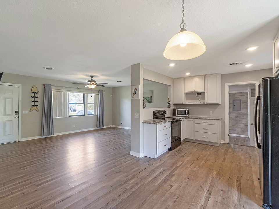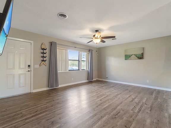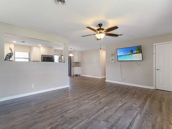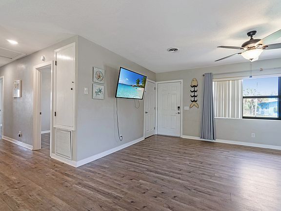 Inside, you'll love the open-concept layout created by a 2020 remodel that opened the kitchen to the living room, perfect for entertaining or relaxing after a day on the water. The home features luxury vinyl plank flooring throughout, double pane windows, and quick-close hurricane shutters for peace of mind.