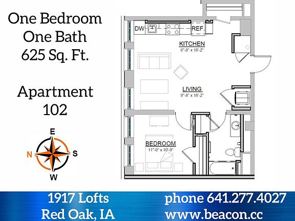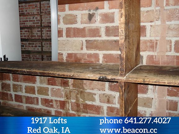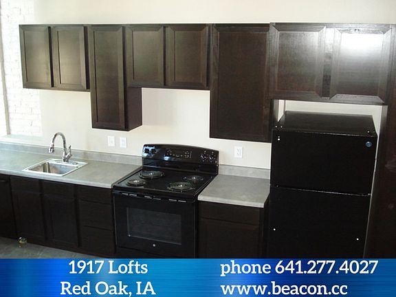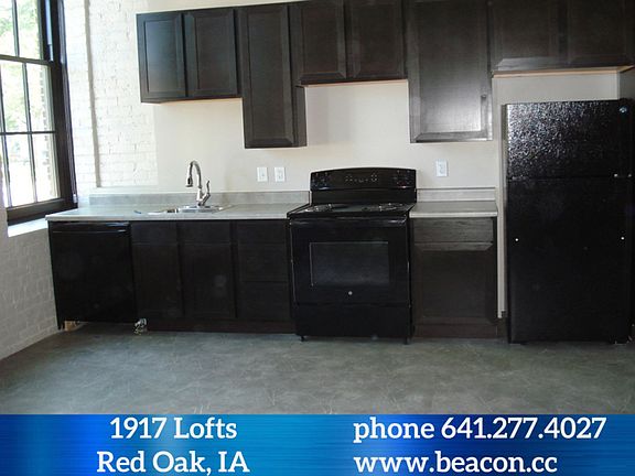 1917 Lofts in Red Oak, Iowa. Apartment #102. This first-floor apartment offers 5 large north facing windows and soaring ceilings. The living room has three large windows and an open concept kitchen. A pantry with built in shelving and red brick is found to the right of the kitchen. Exposed brick (painted white) is found along the exterior walls and separation of bedroom areas. A stack washer/dryer is included. The flooring in this apartment is soft touch, grey tile and the bedrooms are carpeted. The bath includes a large closet for linens. The bedroom has two large windows, a closet and ceiling fan. Our apartments are located at 308 E Corning St, Red Oak, IA.