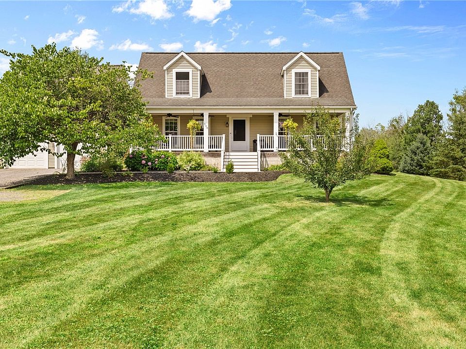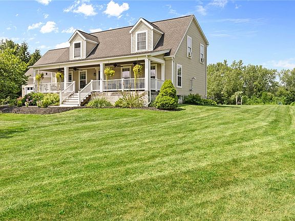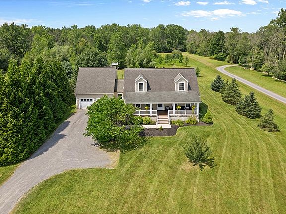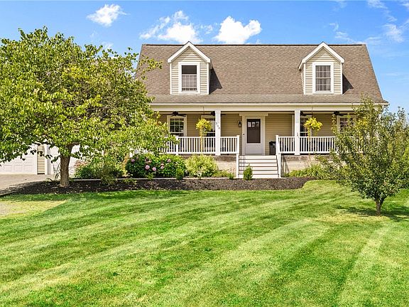 DISCOVER THE CHARM OF COUNTRY LIVING IN THIS LOVELY, SPACIOUS 4-BEDROOM CAPE COD HOME! ENJOY A PEACEFUL & RELAXING LIFESTYLE WITH A BEAUTIFUL FRONT PORCH LARGE ENOUGH FOR DINING & ENTERTAINING FRIENDS AS YOU WATCH THE SUN GO DOWN. RELAX IN THE FORMAL LIVING ROOM OR FAMILY ROOM, BOTH W/ HARDWOOD FLOORS OR COZY UP TO THE PELLET STOVE ON THOSE CHILLY NIGHTS. THE KITCHEN FEATURES AN ISLAND, STAINLESS STEEL APPLIANCES, & A DINING AREA W/ SLIDING GLASS DOORS OPENING ONTO A DECK W/ A VINE-COVERED PERGOLA, THE PERFECT SHELTER ON THOSE HOT SUNNY SUMMER DAYS. THERE'S ALSO A CONVENIENT FIRST FLOOR LAUNDRY RM W/ SEPARATED STORAGE CUBBIES. THE SECOND FLOOR HOSTS A PRIMARY BR W/ A PRIVATE BATH, WHIRLPOOL TUB, & WALK-IN SHOWER. TWO ADDITIONAL BEDROOMS SHARE ANOTHER FULL BATH. THE OVERSIZED GARAGE HAS A WALK UP SECOND FLOOR, OFFERING LOTS OF ADDITIONAL STORAGE OR WORKSHOP! YOU'LL ENJOY THE ABOVE-GROUND POOL & EXTRA STORAGE W/ THE SHED ON NEARLY 3 PRIVATE ACRES & WALKING TRAILS. EXPERIENCE THE SERENITY & NATURAL BEAUTY OF COUNTRY LIVING IN THIS HOME! 5 MIN TO THRUWAY, 15 MIN. TO MALL. MLS SQ. FT DOES NOT MATCH TAX RECORDS DUE TO COMPLETION OF 2ND FLOOR ADDITION.