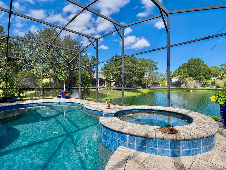 Screened lanaiOversized centerpiece islandSpacious bonus roomSparkling pool and spaDouble ovensPrivate outdoor oasis