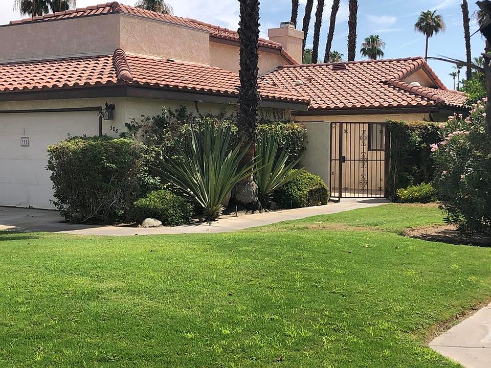Corner unit with park like setting and close to the pool! 2 bedrooms, 2bathrooms, attached garage, fireplace, and private courtyard! Close driving distance to shopping and dining on El Paseo and Hwy 111! Located in Park Palms a gated community. Beautiful lakes in complex.