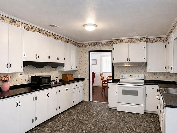 The kitchen retains its classic character with ample cabinetry, generous counter space, and a functional layout that connects easily to the dining area. Bedrooms are well sized and filled with natural light and distinctive decorative elements that speak to the home's history. Bathrooms maintain their traditional style with vintage fixtures and tiled surrounds.