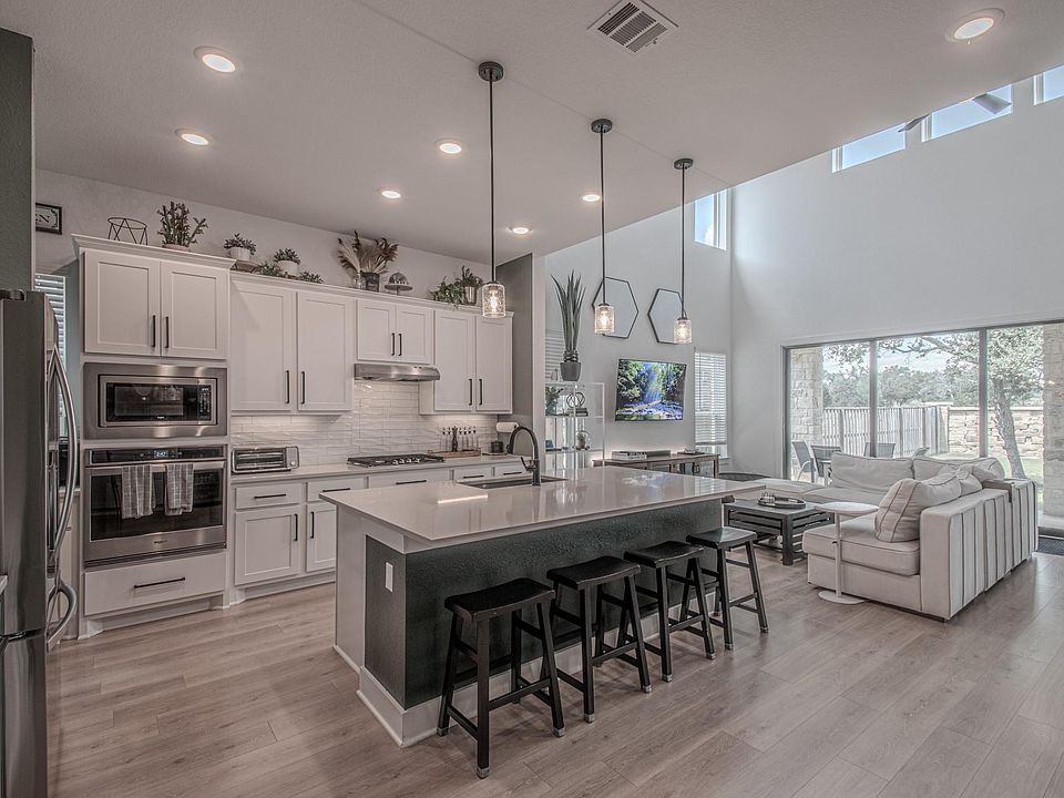 Big news! An assumable a 4.25% loan for eligible buyers. That’s real savings you can feel every month! Better than new in Parmer Ranch—don’t wait to build! This turnkey 5-bedroom, 4-bathroom home features 3,068 square feet of thoughtfully designed living space with high-quality modern finishes and seamless flow. The open-concept main level is anchored by the impressive chef’s kitchen with oversized island, built-in oven and microwave, gas cooktop, walk-in pantry, quartz countertops, and other premium finishes. The bright living room boasts tall windows, soaring ceilings, and a stunning wall of sliding glass doors that seamlessly connects the indoors and outdoors. Just beyond, a covered patio ensures year-round enjoyment, offering the added privacy of no rear neighbor. The main-level primary suite is a gorgeous retreat featuring a spa-like bathroom with expansive dual vanities, soaking tub, frameless glass shower, and walk-in closet leading conveniently to direct access to the utility room. A built-in mudroom space next to the garage entrance creates a convenient drop zone for everyday life. An additional downstairs room near the foyer offers separation from the other rooms for a quiet home office or bedroom. Upstairs, guests will appreciate a special bedroom featuring its own en suite bathroom perfect for visitors or multigenerational living. A second living area offers flexibility for a game room, media lounge, or gym. Don’t miss the cute nook off the nursery for reading, playtime, and imagination. Parmer Ranch is a vibrant community with resort-style amenities, including a pool, playgrounds, sports courts, pickleball, and miles of scenic trails. Exciting new Heirloom master-planned community - expected to break ground in early 2026! Millbend is located less than 2 miles away from this AMAZING new development.