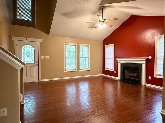 The main level features hardwood floors throughout and a very spacious living room with high ceilings and a cozy fireplace. The kitchen is clean and practical, with wood cabinets, a pantry/food-storage closet, and access to the back porch. Upstairs, the master bedroom includes a walk-in closet and private bath, while two additional bedrooms with standard closets share a second full bathroom.