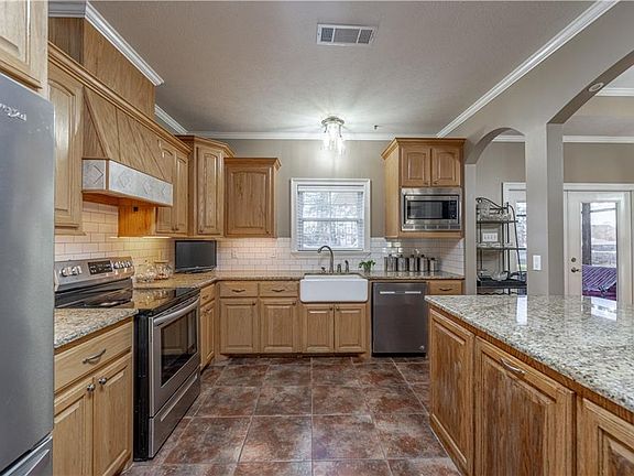 This stunning 4-bedroom, 2.5-bath home features a desirable split floor plan and a spacious kitchen equipped with granite countertops and stainless-steel appliances. The large primary bedroom boasts oversized walk-in closets, and an on suite bathroom complete with a custom-built shower and a separate jetted tub for ultimate relaxation. The modern kitchen is highlighted by a charming custom brick archway, adding character to the space. Step outside to enjoy a large, screened porch, which opens to a 40x20 wraparound deck—great for savoring your morning coffee or hosting gatherings. The backyard is fully enclosed with a newly installed 5-foot chain-link fence, offering security. The property also includes a custom-built 20x35 storage building on a concrete slab, fully wired with outlets and lighting, great for a workshop or additional storage needs. A 2-car garage completes this home, featuring a custom-built workbench and automatic garage door openers for added convenience.