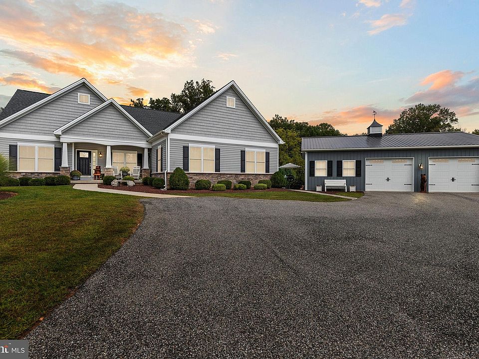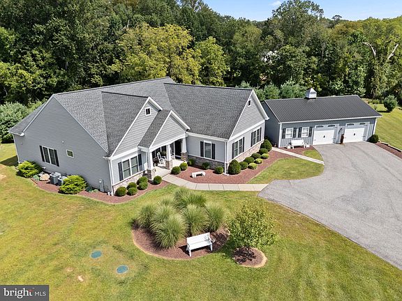 This versatile home with separate living quarters offers comfort, style, and modern living on one level, with additional finished basement space. Step into the bright and inviting living room, featuring hardwood floors, chair rails, crown molding, recessed lighting, a ceiling fan, and a cozy gas fireplace. The open dining area flows seamlessly from the living room and leads to a small deck, perfect for morning coffee or outdoor entertaining. The chef’s kitchen is the heart of the home, featuring gray granite countertops, a large island with a farm sink, 42-inch custom cabinetry, and upgraded stainless steel appliances, including a French-door refrigerator. The main level also includes two well-appointed bedrooms with hardwood floors, double-door closets, plantation shutters, and a full bath with tile flooring and a tub/shower combo. The spacious primary suite is a private retreat with hardwood floors, a barn-door walk-in closet, a tray ceiling, and a spa-like bath featuring stone tile flooring, dual vanities, and a stylish walk-in shower. Laundry hookups are conveniently located nearby. The partially finished walkout basement adds a massive amount of living space, including a recreation room, powder room, craft room, and abundant storage. A true highlight of the property is the fully equipped in-law suite, offering complete, independent living with its own entrance, family room, full kitchen with granite countertops and stainless steel appliances, bedroom with double-door closet, jack-and-jill bath with walk-in shower, and a second laundry hookup—perfect for multigenerational living or long-term guests. Outside, multiple decks, a huge detached garage with full electric and workshop, a large pole building, and sprawling acreage provide endless possibilities for hobbies, storage, outdoor entertaining, and enjoying every season. Built in 2017 and meticulously maintained, this home combines modern amenities, timeless charm, and incredible versatility.