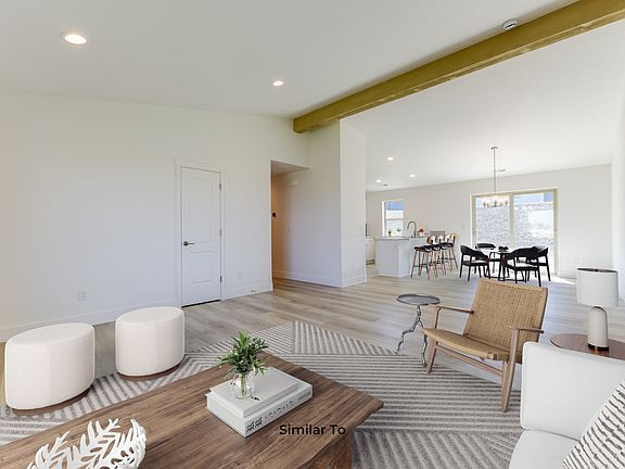 Designed with an expansive open concept integrating the great room, dining, and kitchen areas seamlessly. Unique kitchen layout and impressive vaulted ceiling set this home apart. Ideal for culinary enthusiasts, the kitchen boasts ample counter space and seating at the bar, perfect for gatherings. The main suite offers a luxurious walk-in closet and a private bathroom with a spacious walk-in shower. Two bedrooms are situated at the opposite end of the home, with a bathroom conveniently nestled between them.