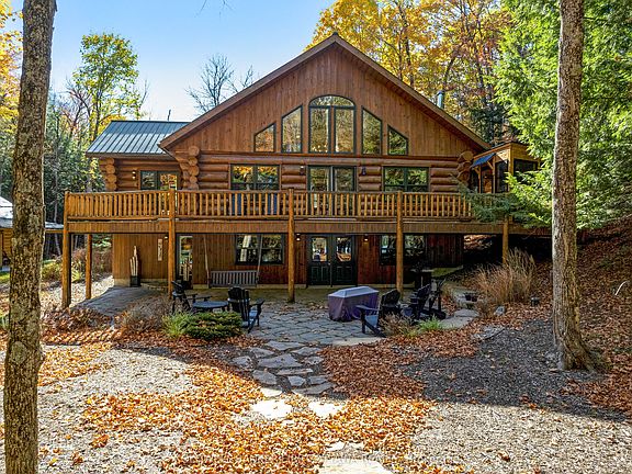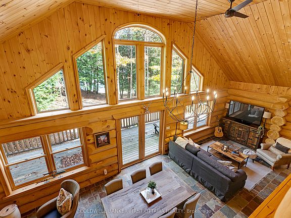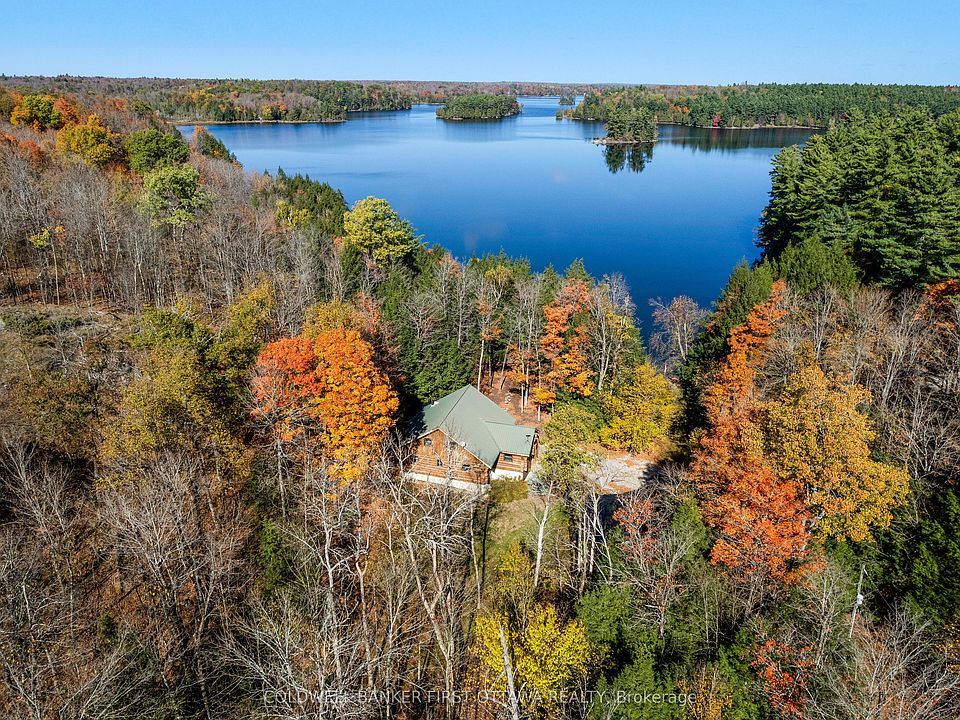 Lakefront luxury living on 6 lovely acres along Bennett Lake. Located in prestigious Bennett Lake Estates, exceptional walkout Scandinavian log home with traditional warmth of log construction while offering bright contemporary spaces. The 4bed, 2 full bath home's honey-hue logs create light-filled airy rooms that enhance the grand open floor plan. Welcoming wrap-about deck opens to Great Room and kitchen featuring impressive slate floors and efficient Jotul fireplace stove. Cathedral ceiling 16' high, wall of soaring windows and garden doors to extensive, entertainment-sized, deck. Gleaming kitchen showcases upscale white cabinetry including elegant glass display cabinets; the complementary ebony toned island-breakfast bar is designed for casual dining or family gatherings. Sun soaked den/office has windows on all sides and garden door to upper deck. Wonderful sunroom with cascading Weatherwall windows and access to upper deck. Main floor primary bedroom and 4-pc bathroom with slate floor, two-sink vanity plus shower with slate wall. Upstairs is huge open loft for flex space or bedroom, with finished pine plank flooring. Lower level family room walkout double doors to covered stone patio with picture-perfect views of the lake. Lower level also has rec room, two bedrooms with sliding barn doors and 4 pc bathroom of porcelain sink, extra deep soaker tub plus rainhead glass shower. Detached double garage 60 amps with 250V, concrete floor and overhead heater. Attached to garage is charming covered porch, for times of quiet reflection. Both home & garage have metal roof. Waterfront 319', sandy, rocky and natural. Shoreline is shallow and then deepens. End of dock 8-10' for swimming, fishing & boating. Bennett Lake connects to Fagan Lake for extended boating. As resident of Bennett Lake Estates, you have deeded shared access to the community's two private waterfront lots, one with a boat launch. Private road with maintenance and snow plowing $450/year. 30 mins to Perth
