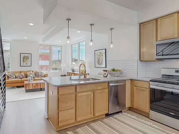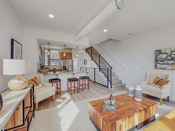 Move-in ready contemporary townhome with lovely downtown views. It comes with stainless steel appliances, vinyl windows and flooring, and a stackable washer and dryer. The open-concept floor plan on the second floor makes for a spacious kitchen, living, and dining room. Two cozy bedrooms, a primary bathroom, a 1/2 guest bath, spacious closets, and an attached one-car garage are just a few other excellent features of this home. Please note all photos are from the model home and floorplan layouts may vary. Square footage provided by the builder.