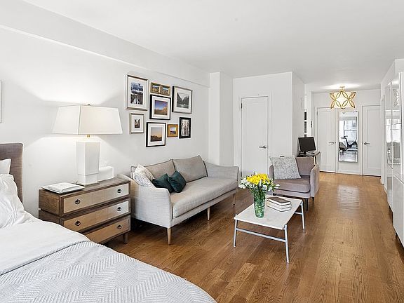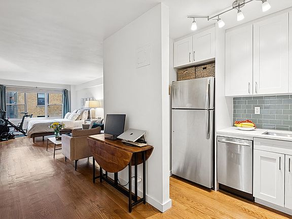 Move In Ready Perfection. Quiet and desirable south facing studio offers instant organization with two entryway closets and a well crafted renovated kitchen. The beautiful kitchen with marble style quartz countertops offer practical and durable surfaces surrounding a good sized stainless steel sink with quality faucet. The white shaker cabinet reach to the ceiling and offer the most storage possible. Grey-blue glossy tiles compliment the stainless steel dishwasher, refrigerator and range. The large studio is your own soothing retreat from busy city life with the pristine updated bath, smooth living room walls and glossy light oak hardwood floors from end to end for a calm unified look. The well designed space offers a third closet in the living area. Your view from the large window encompasses the charming low brownstones and plenty of light filled sky. Low maintenance includes a part-time doorman, live-in super and amazing roof deck with seating and vistas from open skies to the rich cityscape. A half block away on 103rd Street is the entrance to Riverside Park with it's tennis courts, walking and bike paths, basketball courts, soccer courts, handball courts and a skate park. The Hudson River Waterfront Greenway is right there for your enjoyment. The building provides two elevators, easy ramp access, laundry room, and allows guarantors, co-purchases and pied-a-terre. The building is up-to-date on local laws and all assessments paid for by the owner covered conversion to gas, elevator modernization, and basement and laundry room updates. There is new carpeting throughout the building and a renovated front entrance. Part time doorman 7 days a week from 4 p.m. to 12 a.m. Private storage for $20 per month. The vibrant upper west side has the sophistication and convenience of popular restaurants, cafes, multiple specialty shops, and academics with a university close by. The neighborhood is served by the #1 train for north-south access to all of Manhattan. Pets are allowed.