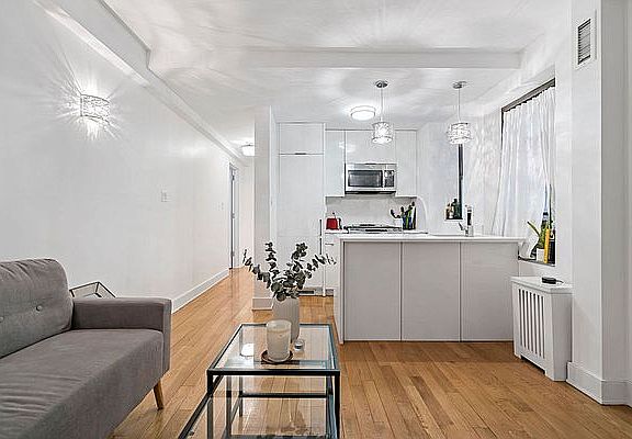 This newly renovated 2 bedroom apartment offers a generous floor plan with custom detail, including oak flooring, customized closets, and contemporary updates. The open kitchen, with a window, has stainless steel appliances, including dishwasher, and is open to the living/dining room area. The main bedroom, which faces the north, is large enough for a king size bed, nigh stands on either side, and a dresser. It also has a large closet. The full bath is gorgeous and also has a window.