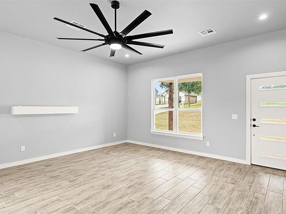 The primary suite is a spa-inspired retreat with a custom barn door, luxurious bath, and large walk-in closet. Energy-efficient windows fill the home with natural light while keeping utility costs low. A standout feature in the living area is the Big Ass Fan brand ceiling fan—sleek and powerful. Built with a post-tension foundation, spray foam wall insulation, and loose-fill attic insulation, this home is engineered for long-term durability.