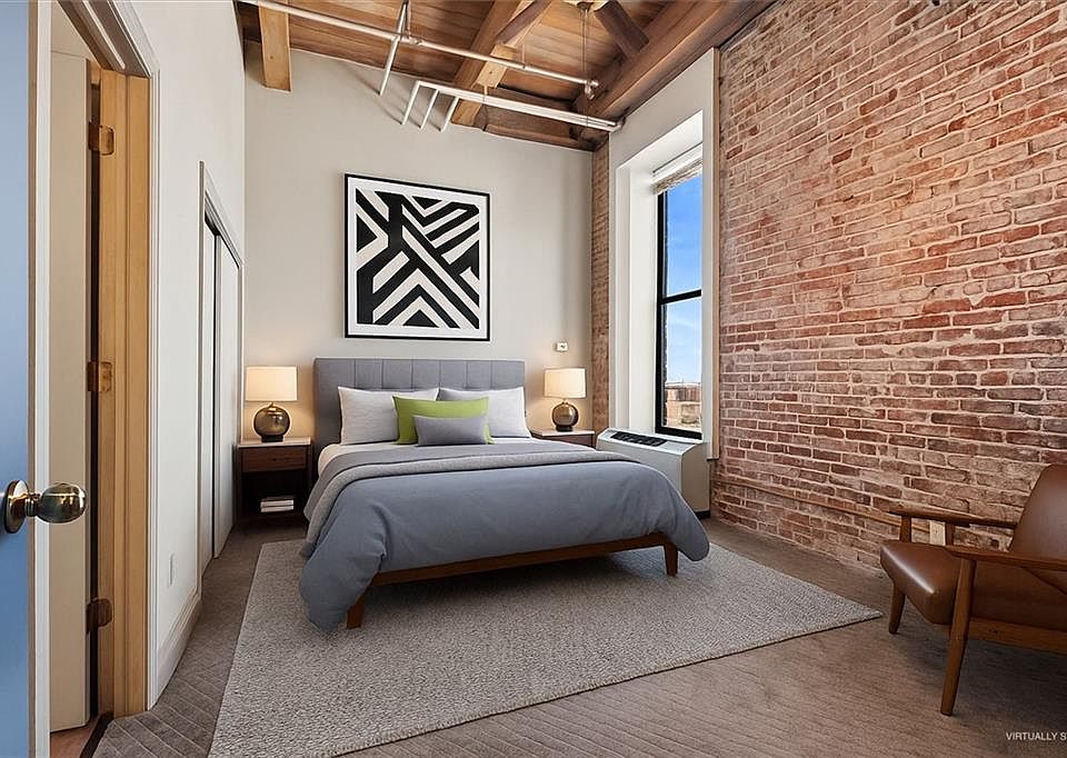 Airy industrial vibeClean contemporary finishesSleek bathroomWell-appointed kitchenExposed brickTongue-and-groove ceilingExpansive windows