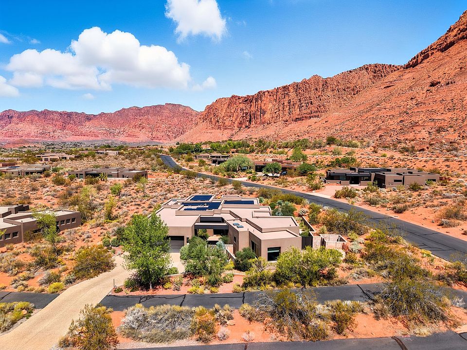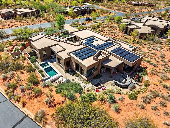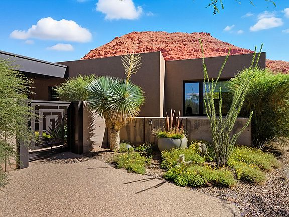 Experience the pinnacle of sophistication in this breathtaking 3-bedroom, 3-bath estate nestled within the serene landscapes of Kayenta in Ivins, Utah. Crafted with uncompromising attention to detail, this architectural masterpiece seamlessly blends timeless design with contemporary elegance, designed by the Gulch Design Group. Step inside to discover an open-concept floor plan, custom picture windows, and designer finishes that flood the home with natural light while framing sweeping views of the iconic red cliffs. The chef's kitchen is a true work of art, showcasing Thermador and Viking appliances, custom granite and quartz countertops, and a spacious island perfect for both entertaining and everyday living. The primary suite serves as a tranquil retreat, featuring a spa-inspired bathroom complete with a walk-in shower, soaking tub, and serene desert views. Outdoors, the meticulously landscaped grounds create a resort-caliber sanctuary with a heated pool and attached spa, an outdoor fire feature, and multiple lounge areas - perfect for hosting gatherings or unwinding beneath spectacular desert sunsets. Additional highlights include solar panels, a stone-surround fireplace, skylights, and motorized blinds, offering both beauty and efficiency.