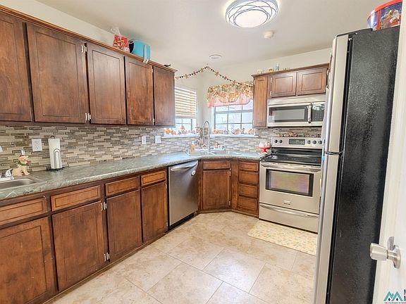 This home includes 3 bedrooms, 2 bathrooms and a single car garage. It is on a quiet cul-de-sac and conveniently located. Only a 15 minute drive to Cannon Air Force Base, 8 minutes to Southwest Cheese factory, and 20 minutes to Eastern New Mexico University. The Kitchen is equipped with stainless steel appliances, abundant counter space, plenty of cabinets, and a large pantry. The master bedroom is privately located opposite of the other two bedrooms. The bathrooms have been updated with contemporary fixtures. The additional bedrooms are generously sized, providing flexibility for a growing family, guests, or a home office. It has a metal roof and is xeriscaped for easy maintenance. A new HVAC system was installed just last year. Has a storage shed in the backyard to free up room in the house. This charming home is a must see. Schedule your appointment today.