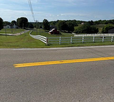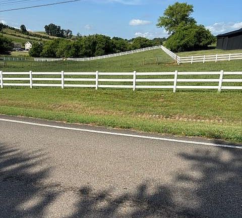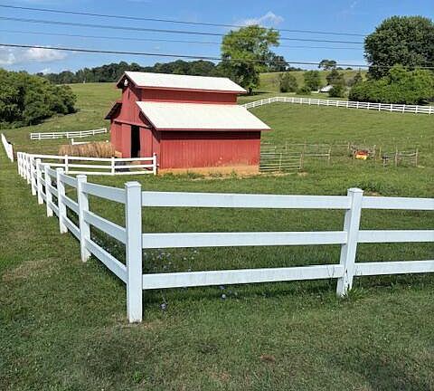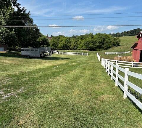 garage with extra wide driveway. Nice kitchen with island, pantry, cherry cabinets, beautiful custom mantle with gas fireplace. Screened and open deck. Fenced with white vinyl plank, Has a nice barn with loft and seperate water stations for horses or cattle. A spring is at the back of the property. Underground dog fence will stay.
